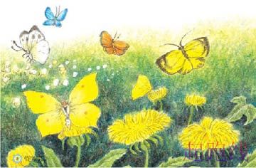 小蝴蝶飞起來去找其他花朵了。咦?他的翅习膀上沾到了什么!原来是蜂花粉。