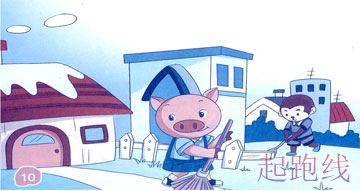 嘿嘿猴回屋之后,哼哼唧唧猪也来清扫庭院。他也发觉绿篱笆墙边难以扫,就想:这堵绿篱笆墙并不是我们家的,嘿嘿猴不扫,我也不扫。