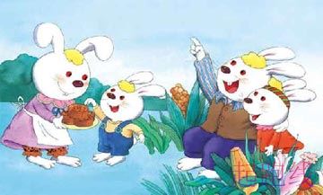 ??? 兔父亲指一指天空的月儿,让小白兔们细心瞧:“月儿里有棵桂花树,树底下有一个小兔子,手上拿着捣药杵,跟随仙女月宫住。”