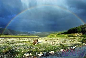 它把雨滴撒向高山,高山马上变为彩虹色的了。