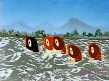 这群小鲤鱼们在大河中拐了好多个弯,再向前游,感觉江河的开间多了,水也深了。她们越过了激流,游到水势缓解的地区,外露河面吐着气,感觉很舒服。